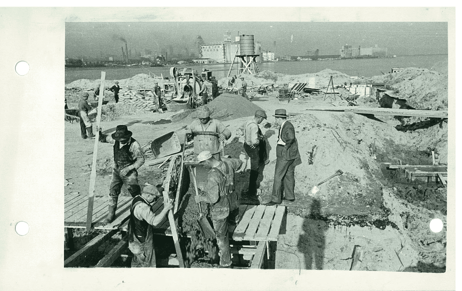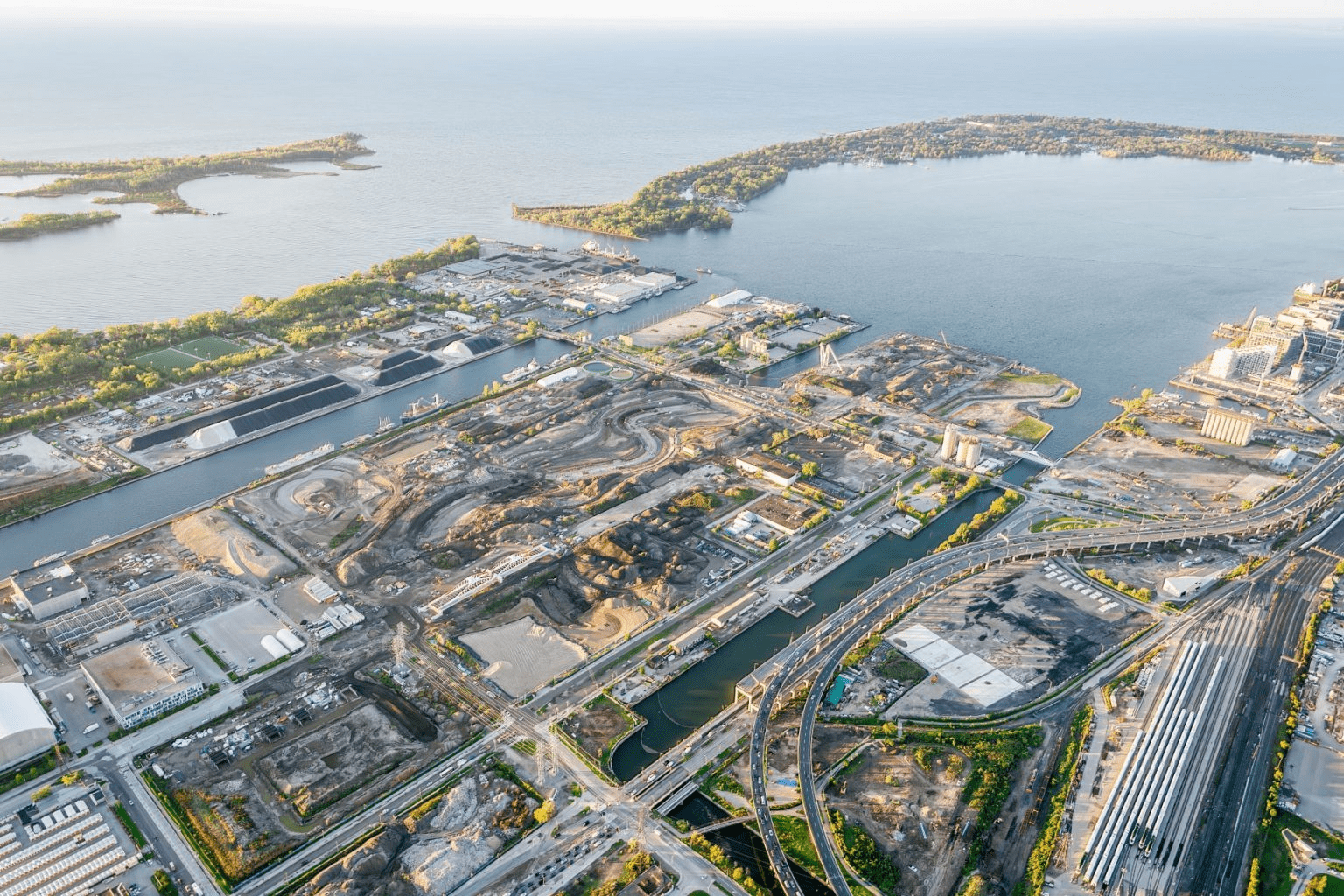 Оскільки значна частина основної торгівлі міста здійснювалася водним шляхом, розміщення виробничих підприємств поруч із набережною стало вигідним рішенням. Фабрики на узбережжі озера дозволяли легко отримувати сировину та ефективно транспортувати готову продукцію. Однак у 1830–1840-х роках нестача доступної землі вздовж набережної серйозно обмежила розвиток судноплавної, промислової та залізничної інфраструктури. У 1850-х роках була проведена масштабна кампанія з насипання ґрунту для розширення берегової лінії на південь до Еспланади. Протягом наступних ста років берег продовжували розширювати все далі на південь. Початкова берегова лінія розташовувалася північніше сучасного залізничного коридору, а вулиця Фронт була побудована вздовж краю цієї лінії. Насипні роботи тривали аж до 1950-х років.